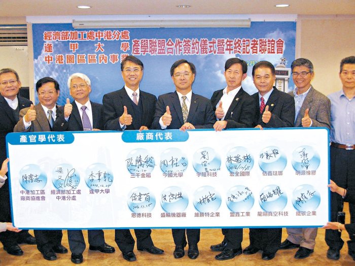 為有效媒合廠商中高階人才,包括宏全國際、今國光學等中港加工出口區12家廠商,昨(25)日與逢甲大學簽訂產學合作聯盟,共同推動「產官學合作無縫接軌計畫」,並首度開放大四學生到工廠實習。